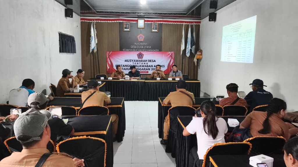 Desa Duda Utara, Kecamatan Selat, Kabupaten Karangasem, melaksanakan Musyawarah Desa (Musdes) tentang Pertanggungjawaban Anggaran Pendapatan dan Belanja Desa (APBDes) Tahun Anggaran 2025. Kegiatan ini berlangsung di Balai Desa Duda Utara dan dihadiri oleh Perbekel beserta perangkat desa, Badan Permusyawaratan Desa (BPD), lembaga desa, tokoh masyarakat, serta perwakilan warga.